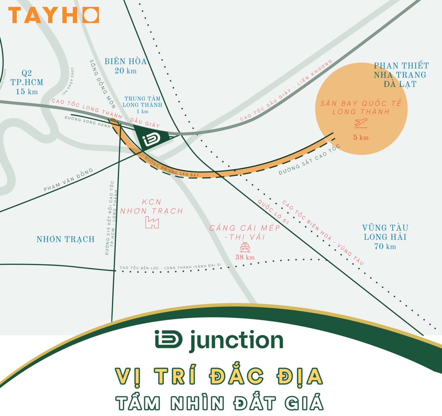 Nằm ngay trong khu dân cư hiện hữu, dự án ID Junction cách sân bay Quốc tế Long Thành 5km, cách đường số 1 – tuyến đường chính dẫn vào sân bay ở giai đoạn 1 vỏn vẹn 1km, đến trung tâm hành chính huyện Long Thành 1,5km. Đặc biệt, dự án không nằm trong phễu bay, nên không bị hạn chế về chiều cao và ảnh hưởng âm thanh ồn ào. Vị trí dự án là trung tâm liên kết vùng được hình thành trong tương lai, tập trung chuyên gia, CB-CNV trong ngành logistics và chuyên gia các KCN. Tại miền Nam, khu vực này sẽ sầm uất chỉ sau TPHCM – trung tâm kinh tế thương mại của cả nước. Kết nối về Quận 1 TPHCM chỉ 30p di chuyển xe ô tô, cách Vincom Long Thành 1km.
